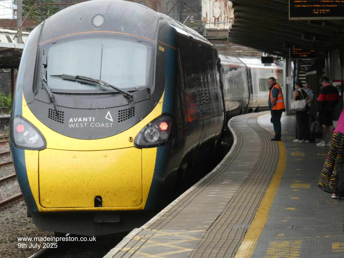 On Platform 1 at Preston Station a Pendolino arrives, can’t say we’ve seen one on Platform 1 before. Nice curve as it leaves.